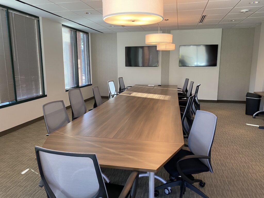 - Wood conference table with high-back ergonomic rolling chairs